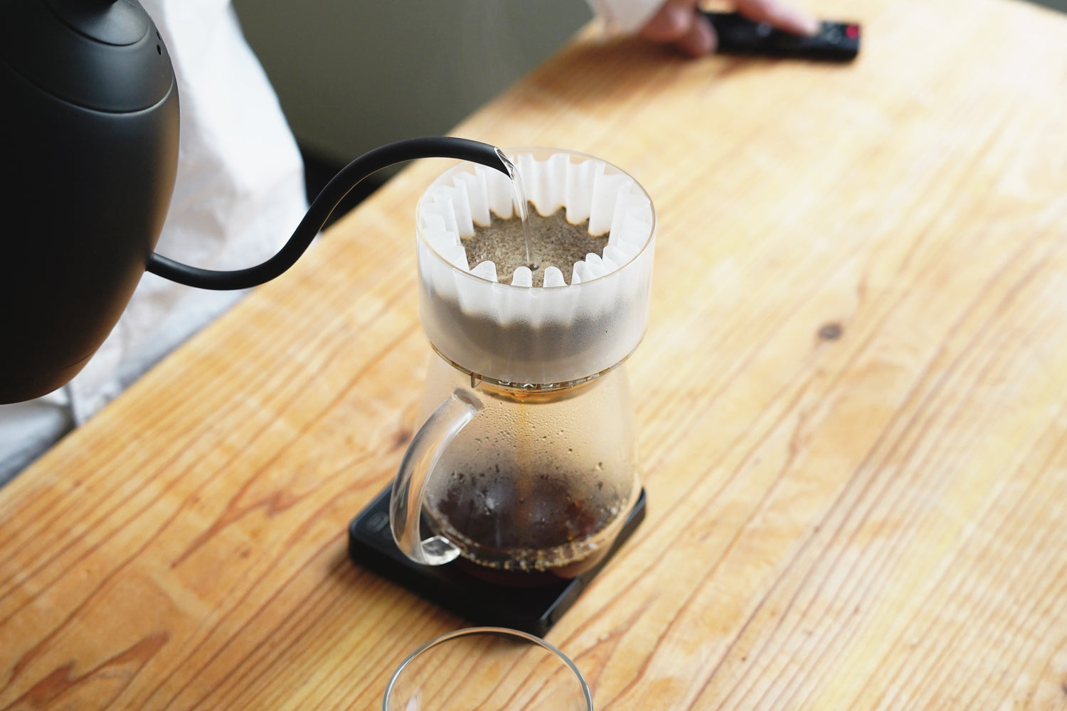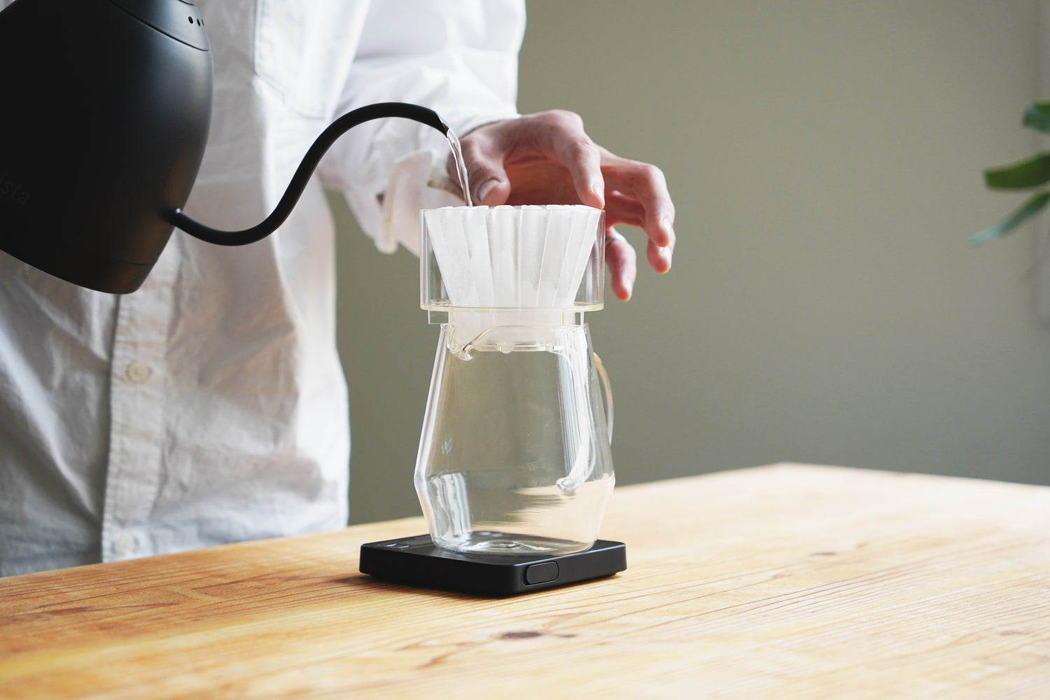器具を温めるため、ペーパーフィルター全体に行き渡るように一度お湯を注ぎます。(この行為をリンスと呼びます)