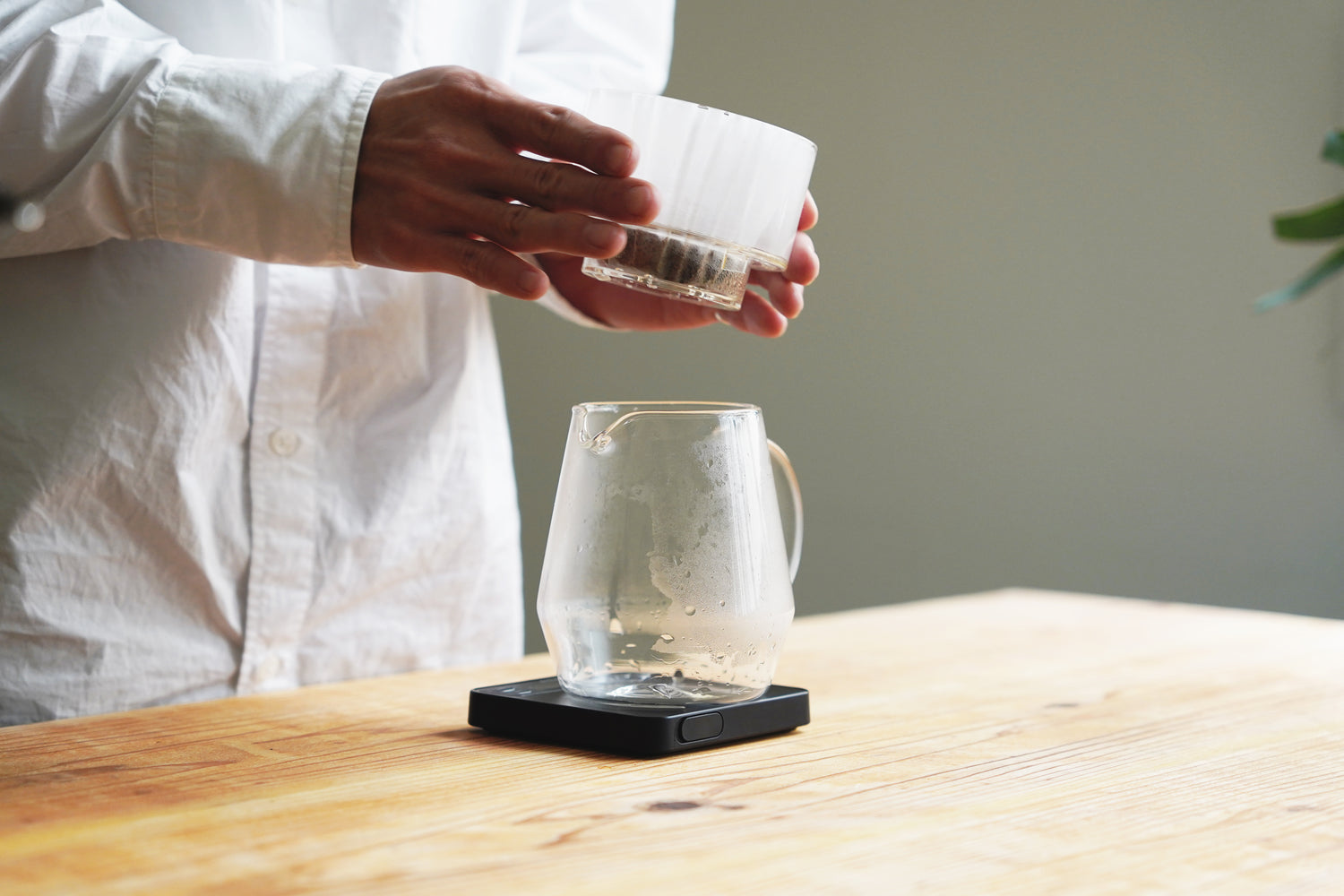 リンス後、再度サーバーとドリッパーをセットし、フィルターの中心にコーヒー粉を入れます。その後軽く揺すって平にならします。(コーヒー粉が均一にお湯に触れるようにするため)