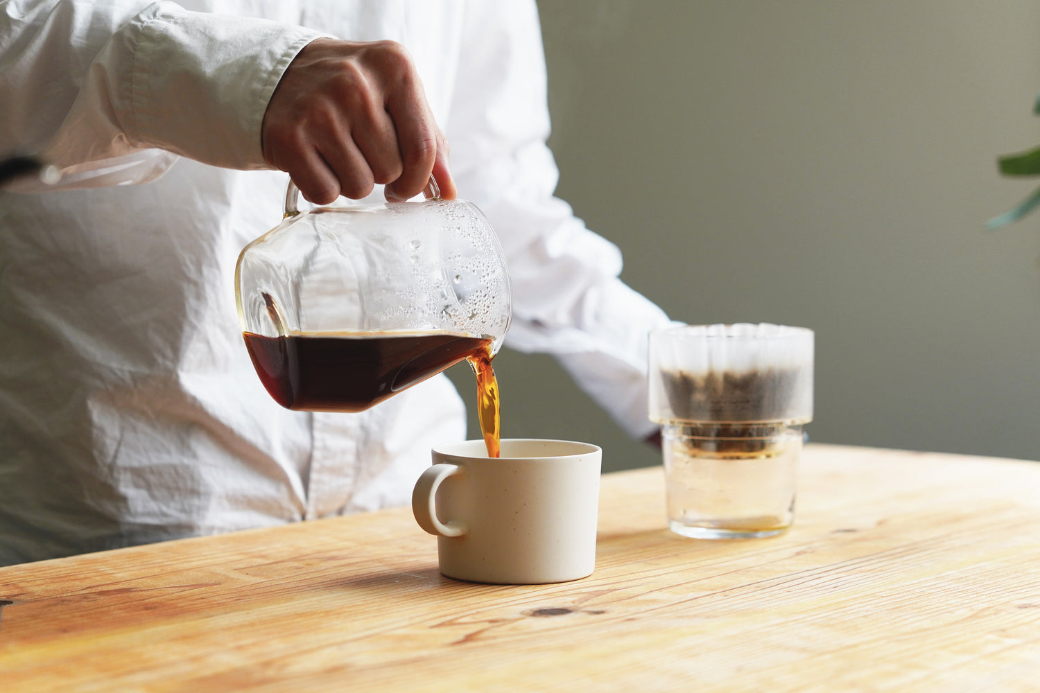 初めは円を描くように粉全体にお湯を行き渡らせるイメージで、その後は中央に1点注湯をしていきます。40〜45秒かけて、220mlまで1投で注ぎ切ります。コーヒーが落ちきったら完成です。