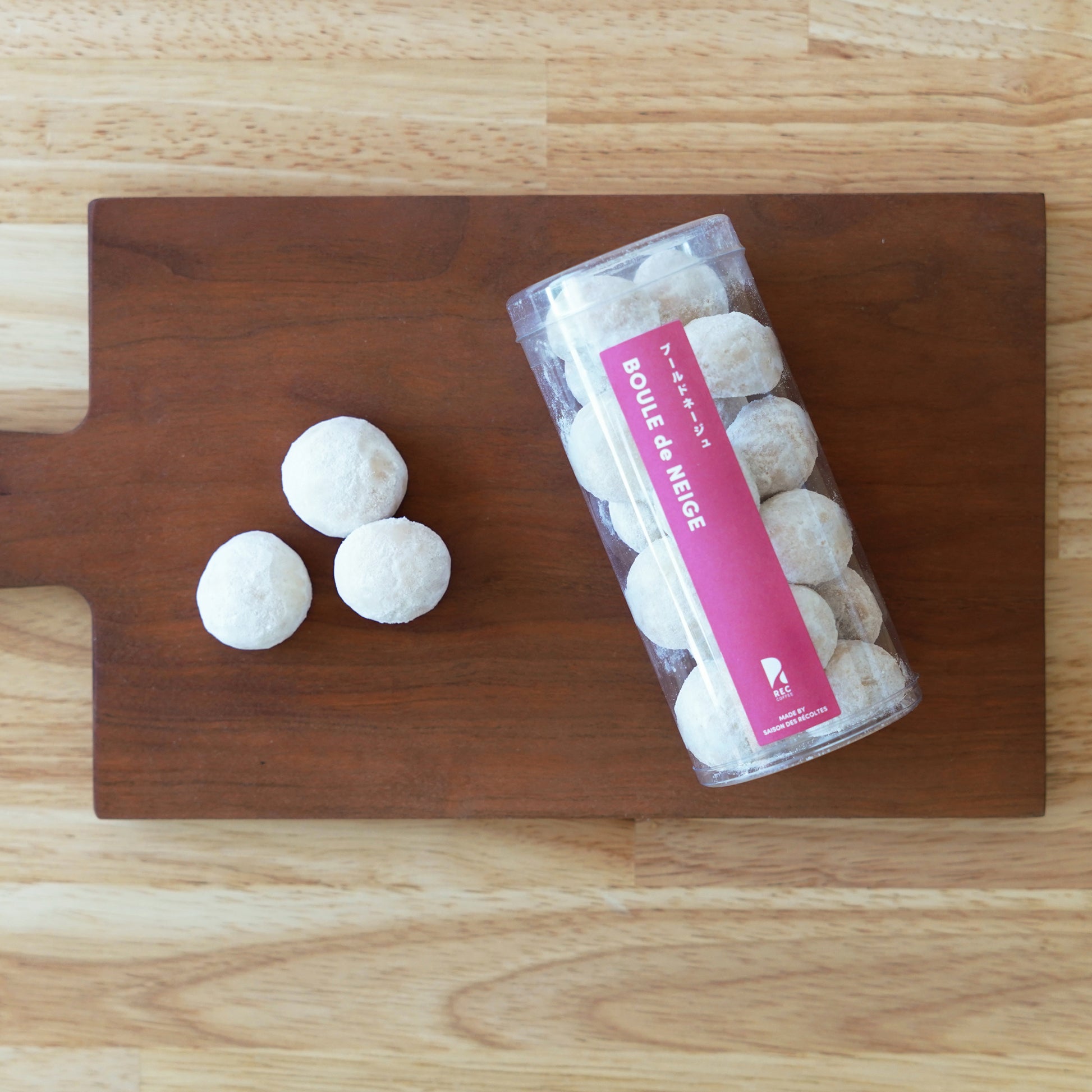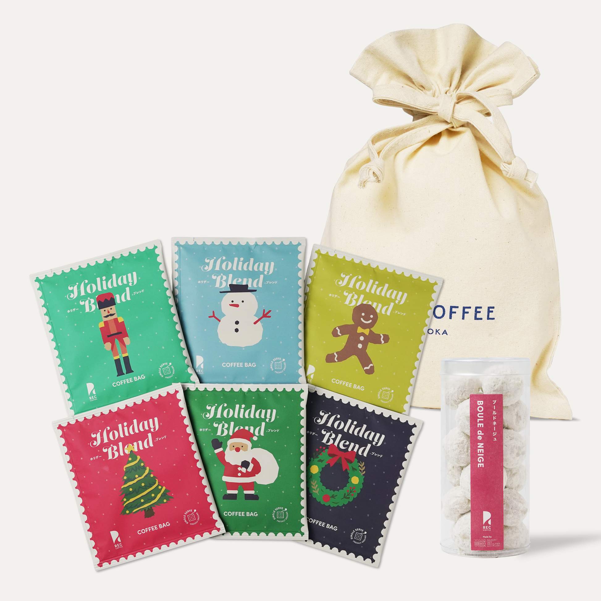 REC COFFEE発のパティスリーブランド「SAISON DES RÉCOLTES(セゾン・デ・レコルト)」でつくる、REC COFFEEのためのブールドネージュと、6種類のかわいいホリデーパッケージのコーヒーバッグが巾着袋に入った商品です。