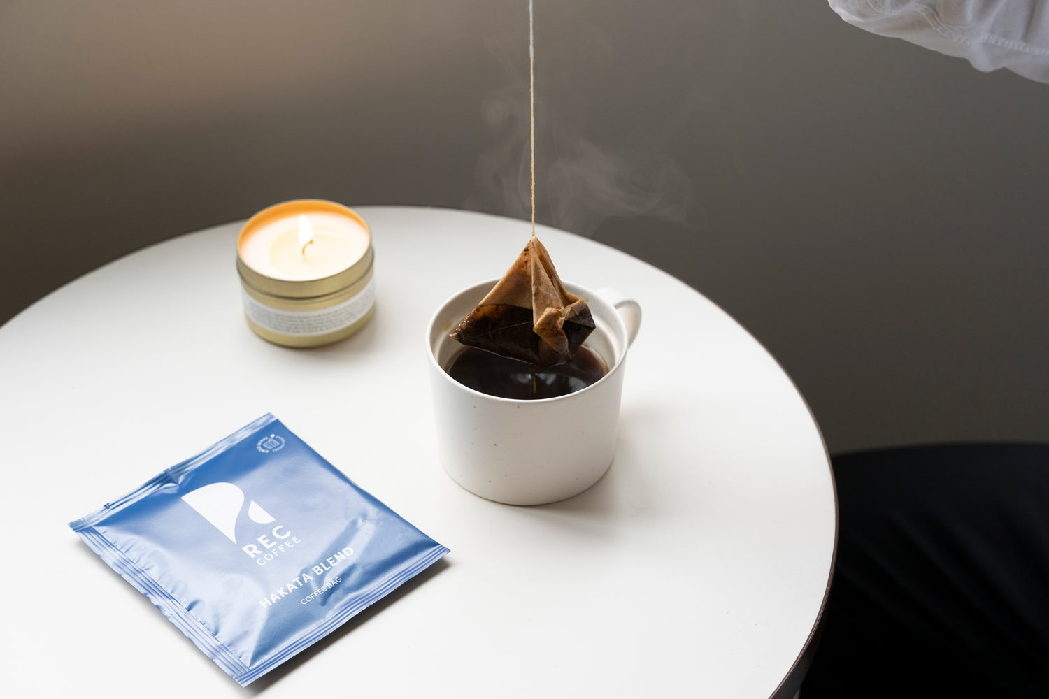 博多の伝統織物である博多織をデザインしたパッケージに五色献上である紫、青、赤、黄、紺にREC COFFEEのブランドカラーであるブルーの6色セットです。