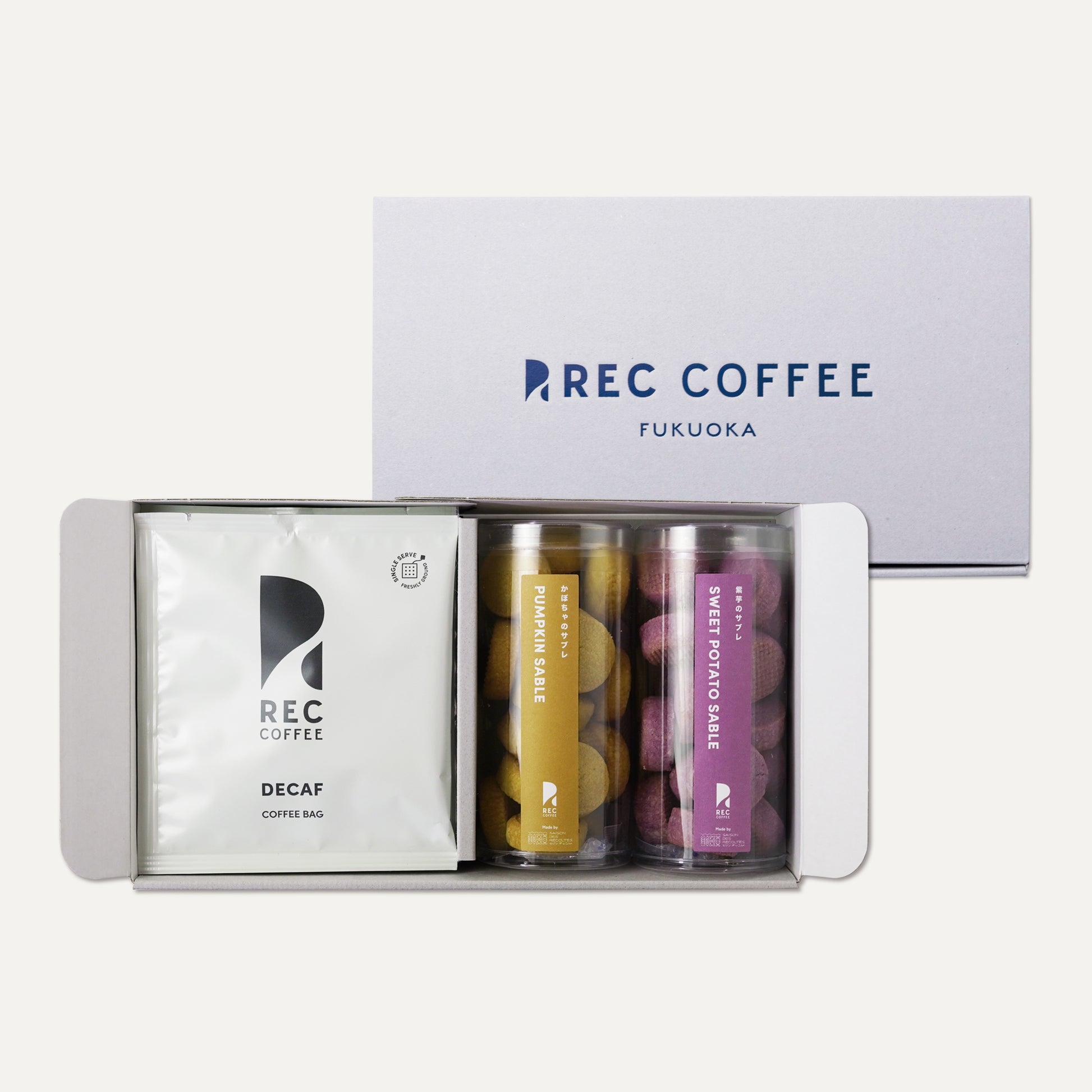 カフェインを99%除去したディカフェのコーヒーバッグとREC COFFEE発のパティスリーブランド「SAISON DES RÉCOLTES(セゾン・デ・レコルト)」でつくる、焼菓子がセットになったギフトです。