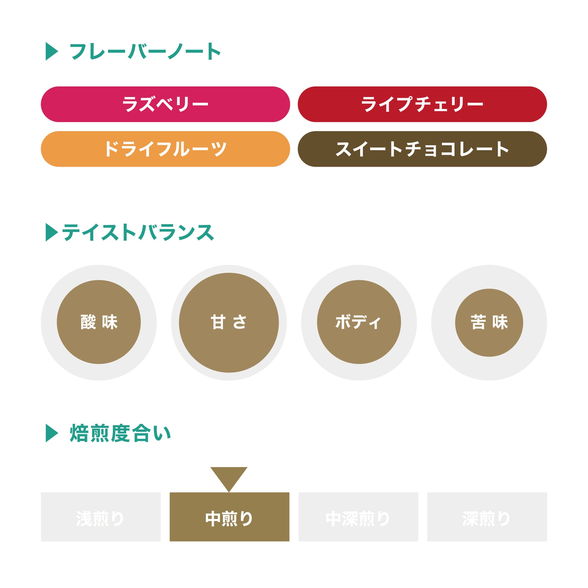 ラズベリーやライプチェリーのような優しい酸味にチョコレートのような味わい。はちみつを思わせるクリアな甘さ、程よいボディ感のあるバランスの良いコーヒーです。