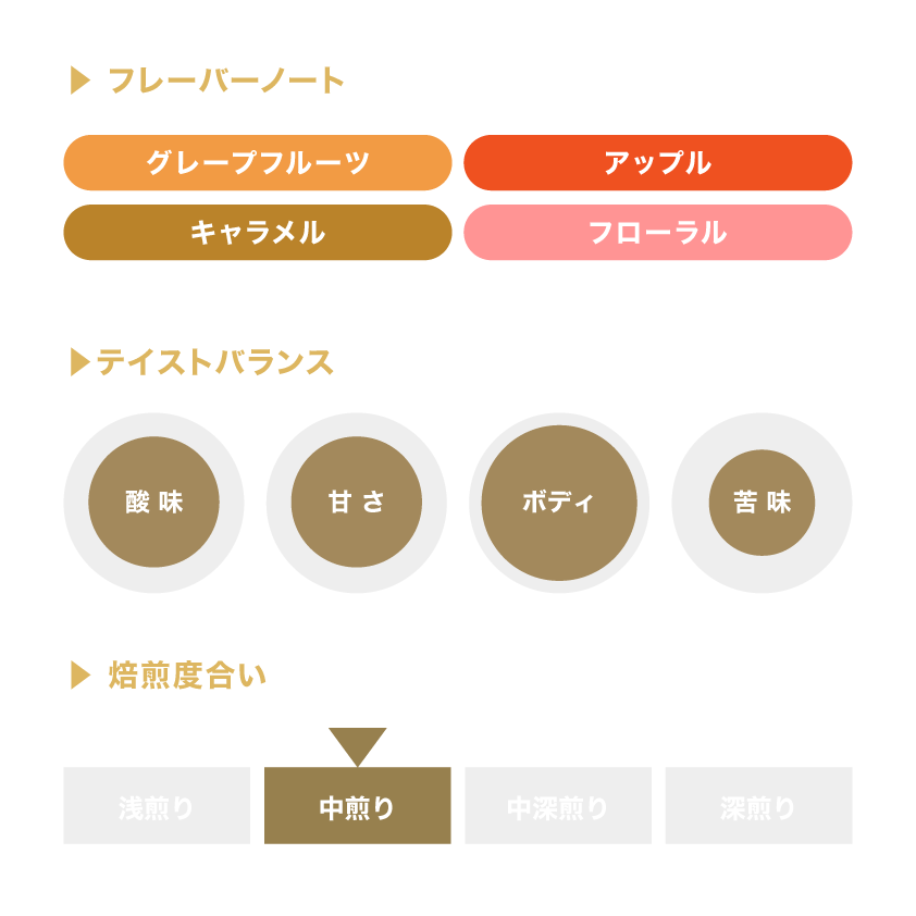 フローラルなアロマ、グレープフルーツやアップルのような果実味をしっかりと感じることができます。程よい発酵感と華やかさ、キャラメルのような甘さ、紅茶に似た感覚もあるとてもユニークなコーヒーです。